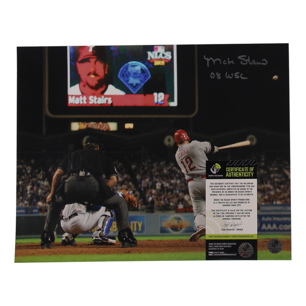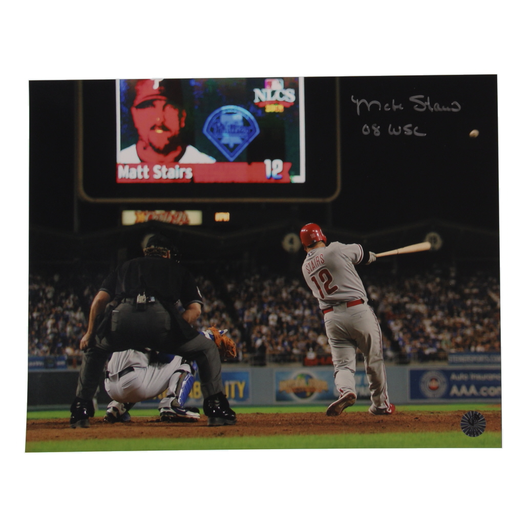 Photograph measures 11" x 14" and has been hand-signed by Matt Stairs (Philadelphia Phillies).
