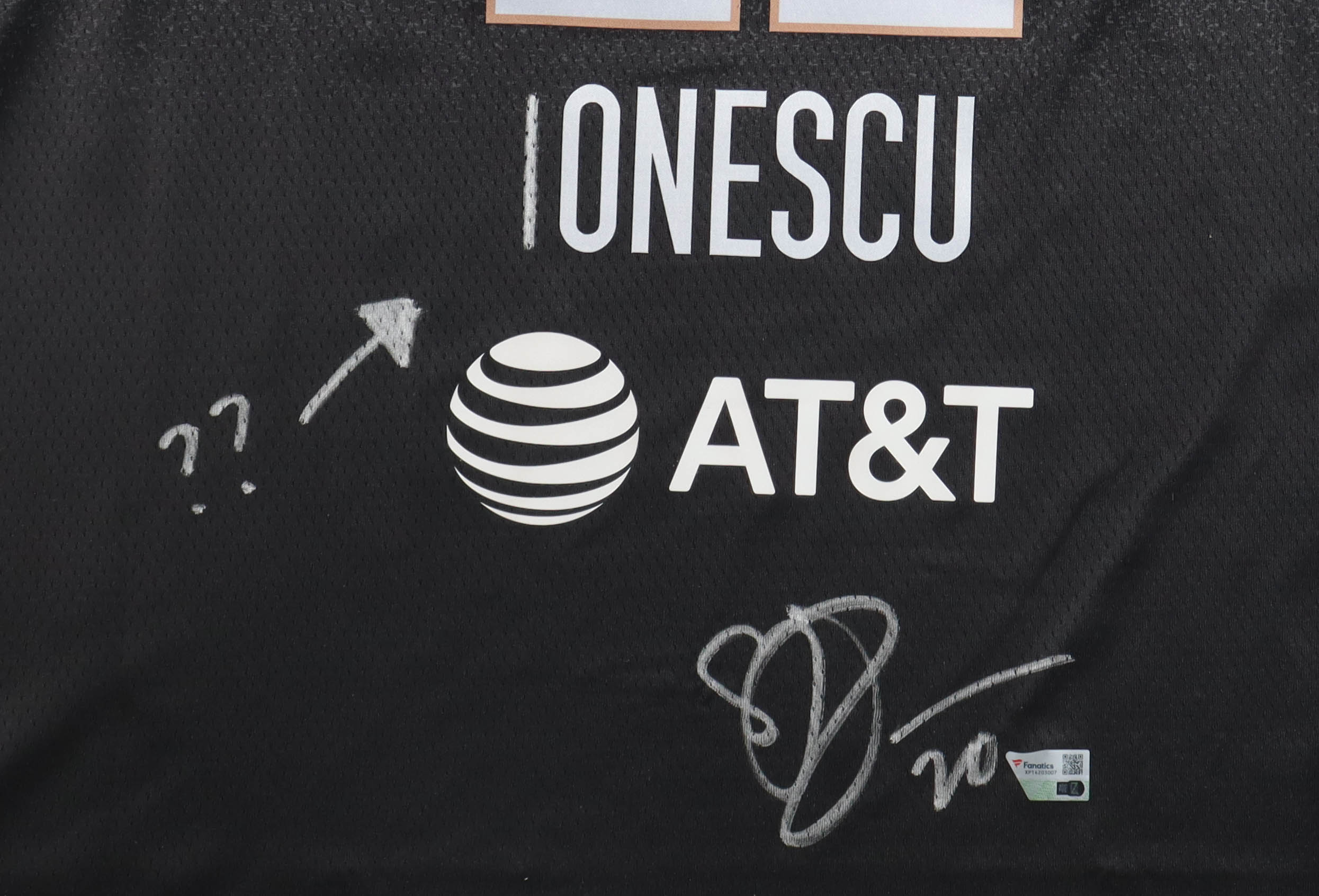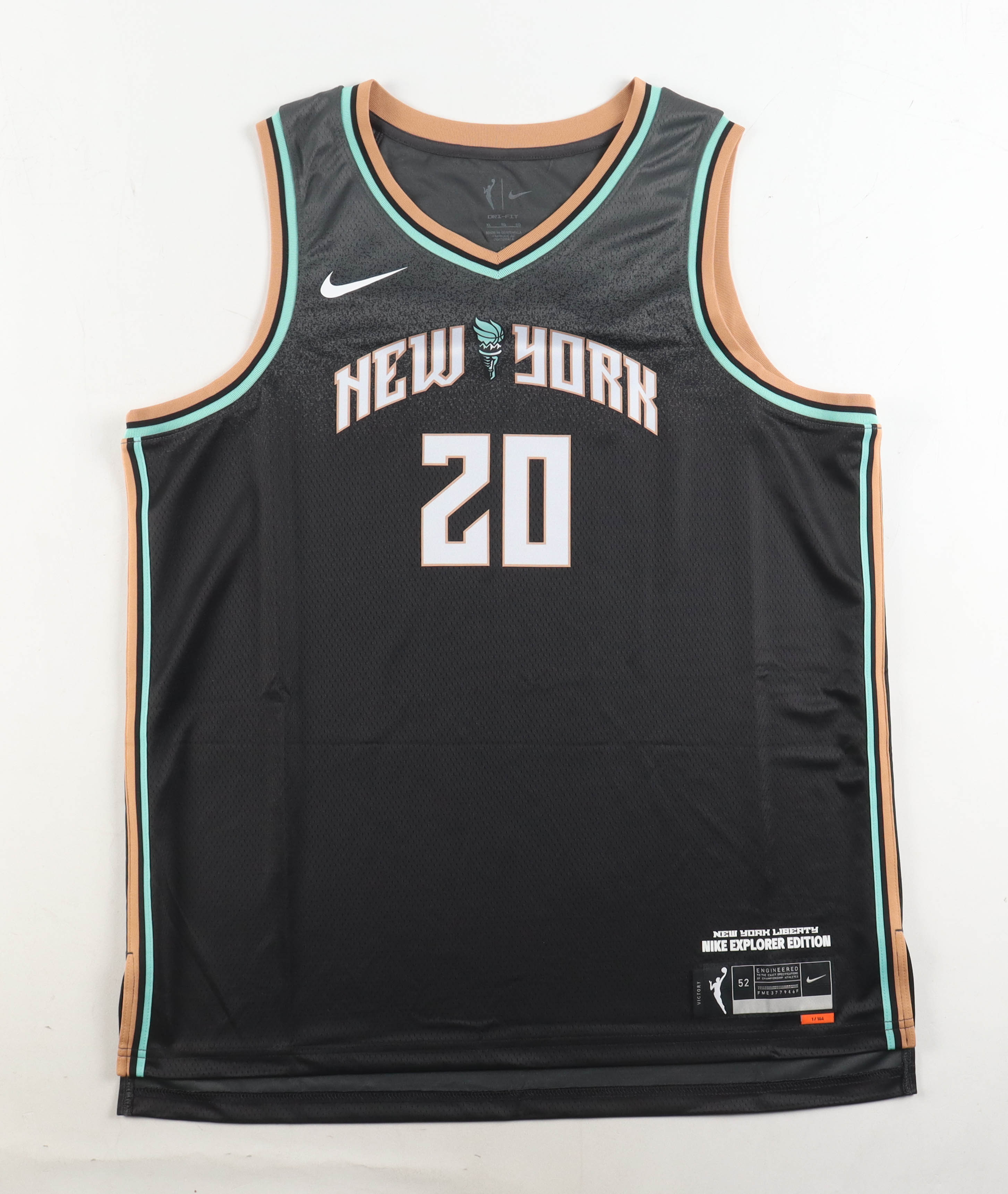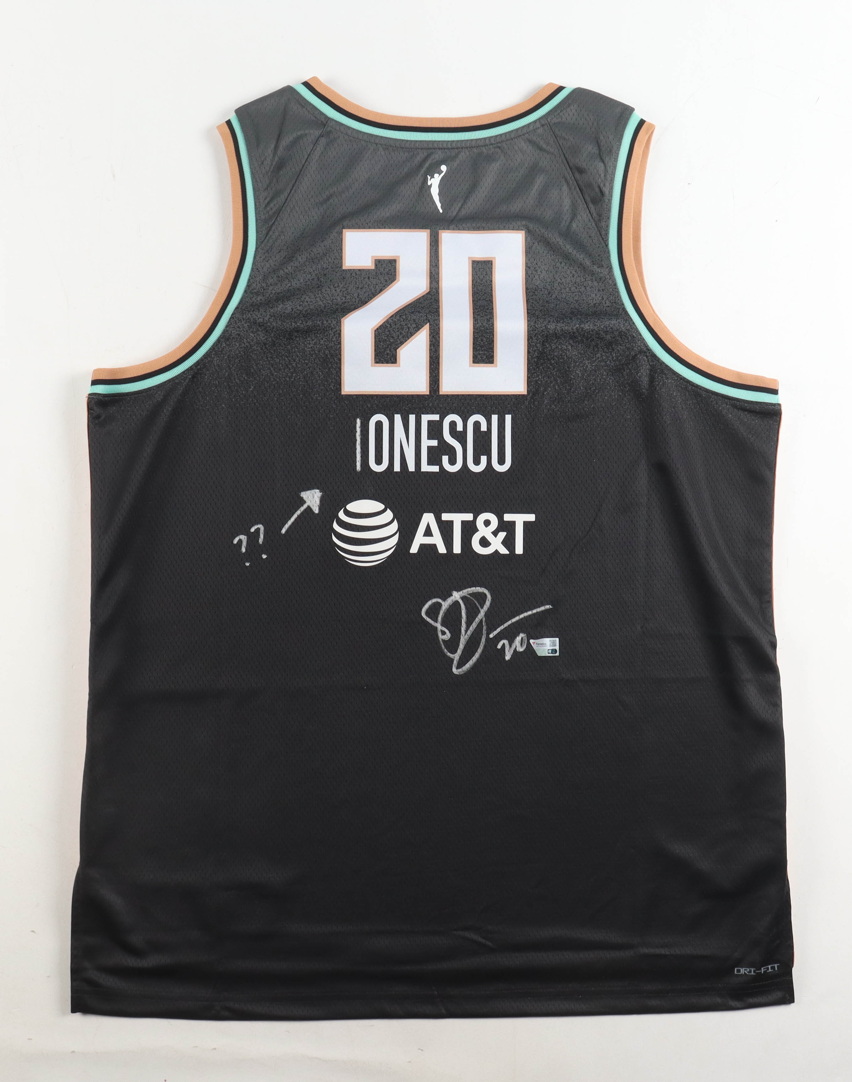 Nike jersey with everything pressed on, size 52. Hand-signed by Sabrina Ionescu (New York Liberty). Please note, “??” has been inscribed by Sabrina Ionescu.