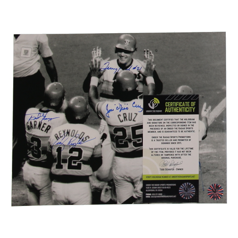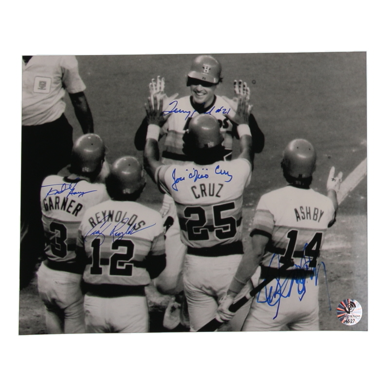 Photograph measures 8" x 10" in size. Hand-signed by Phil Garner, Jose Cruz, Terry Puhl, Alan Ashby, and Craig Reynolds.
