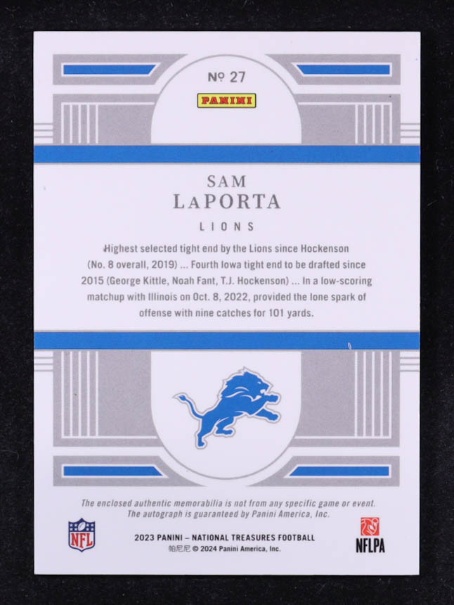 Sam LaPorta 2023 Panini National Treasures Rookie Material Signatures RPS #27 RC #98/99