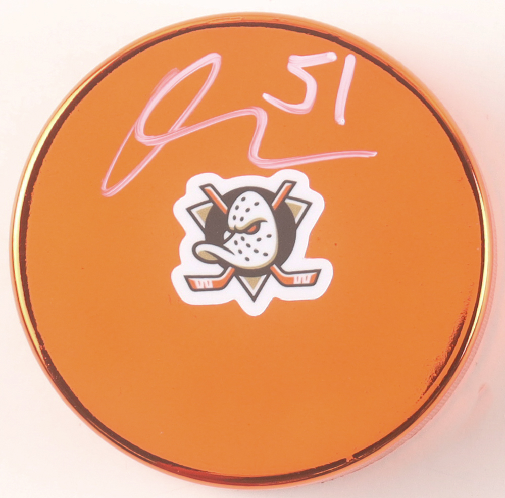 Anaheim Ducks Logo Hockey Puck. Hand-signed by Olen Zellweger. Please note, there is minor scuffing throughout the puck.
