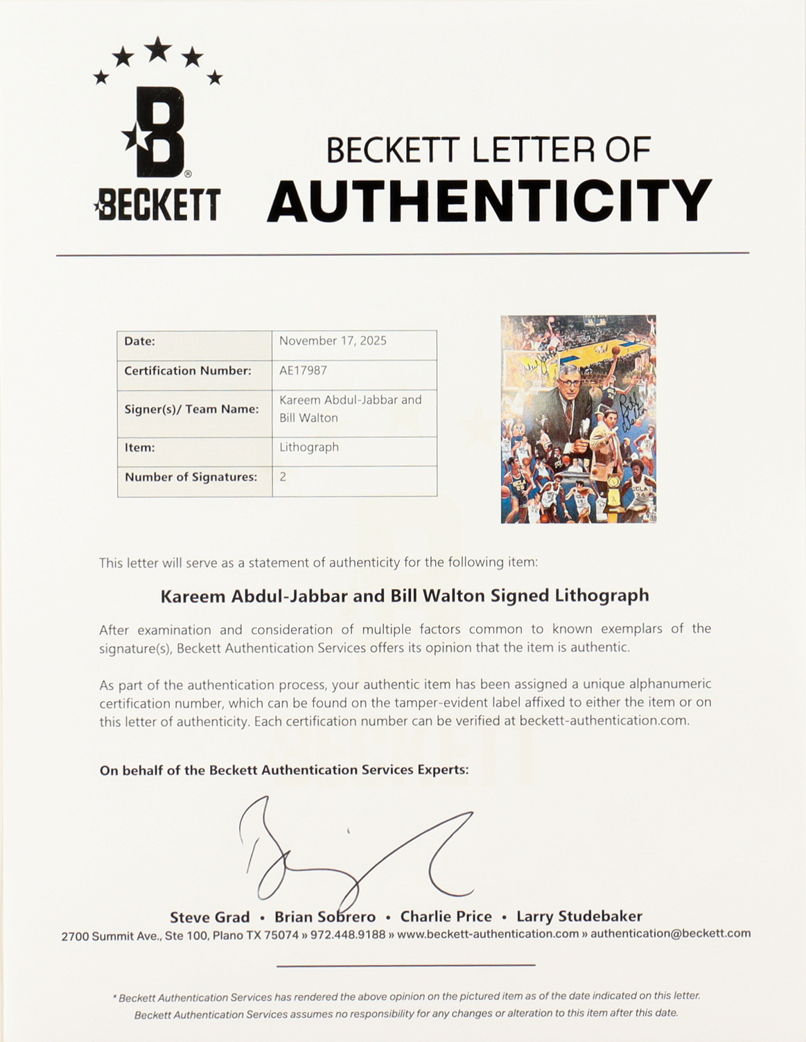 Lithograph measures 18" x 24" in size and has been hand-signed by Kareem Abdul-Jabbar and Bill Walton (UCLA Bruins, HOF). Also hand-signed by the artist Paul Miller. Hand-numbered limited edition 135/400.