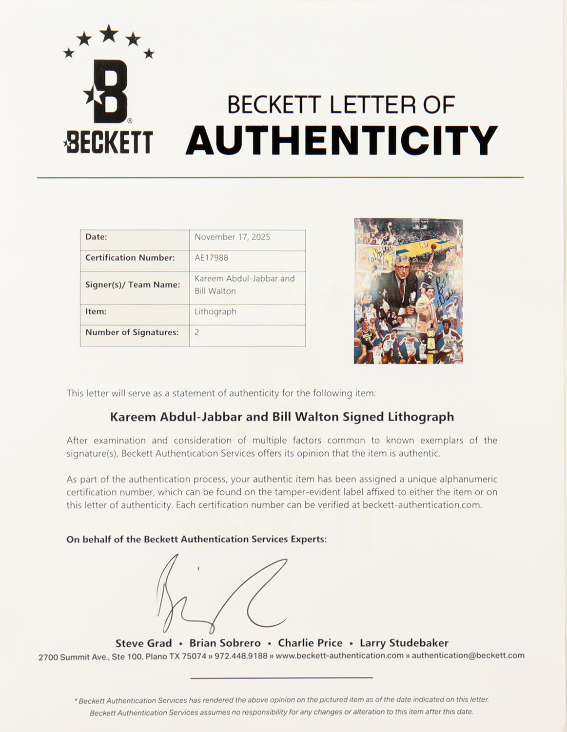 Lithograph measures 18" x 24" in size and has been hand-signed by Kareem Abdul-Jabbar and Bill Walton (UCLA Bruins, HOF). Also hand-signed by the artist Paul Miller. Hand-numbered limited edition 198/400.