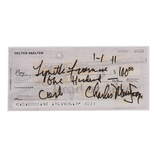 Check dated January 2011 measures approximately 3" x 6" in size and has been hand-signed by Charles Manson (D. 2017).