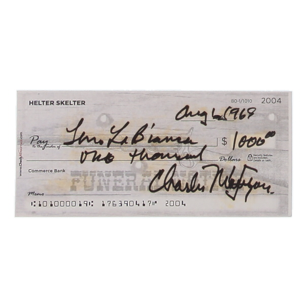 Check dated August 1969 measures approximately 3" x 6" in size and has been hand-signed by Charles Manson (D. 2017).