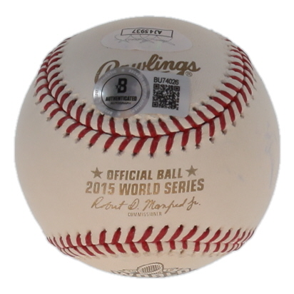 Rawlings Official 2015 World Series logo baseball. Hand-signed by Salvador Perez and Johnny Cueto (Kansas City Royals). Please note, the signature ink has bled.