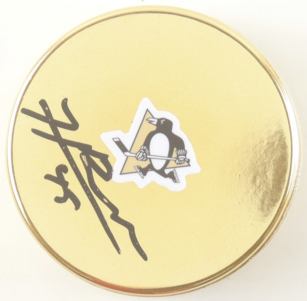 Pittsburgh Penguins Logo Hockey Puck. Hand-signed by Harrison Brunicke. Please note, there is minor scuffing throughout the puck.