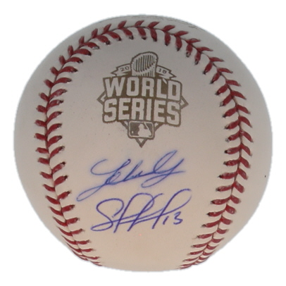 Rawlings Official 2015 World Series logo baseball. Hand-signed by Salvador Perez and Johnny Cueto (Kansas City Royals). Please note, the signature ink has bled.