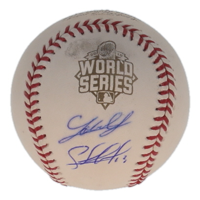 Rawlings Official 2015 World Series logo baseball. Hand-signed by Salvador Perez and Johnny Cueto (Kansas City Royals). Please note, the signature ink has bled.