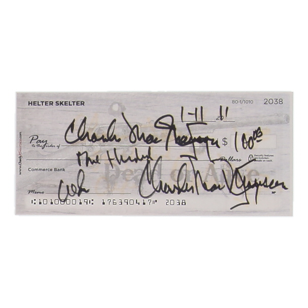 Check dated January 2011 measures approximately 3" x 6" in size and has been hand-signed by Charles Manson (D. 2017).