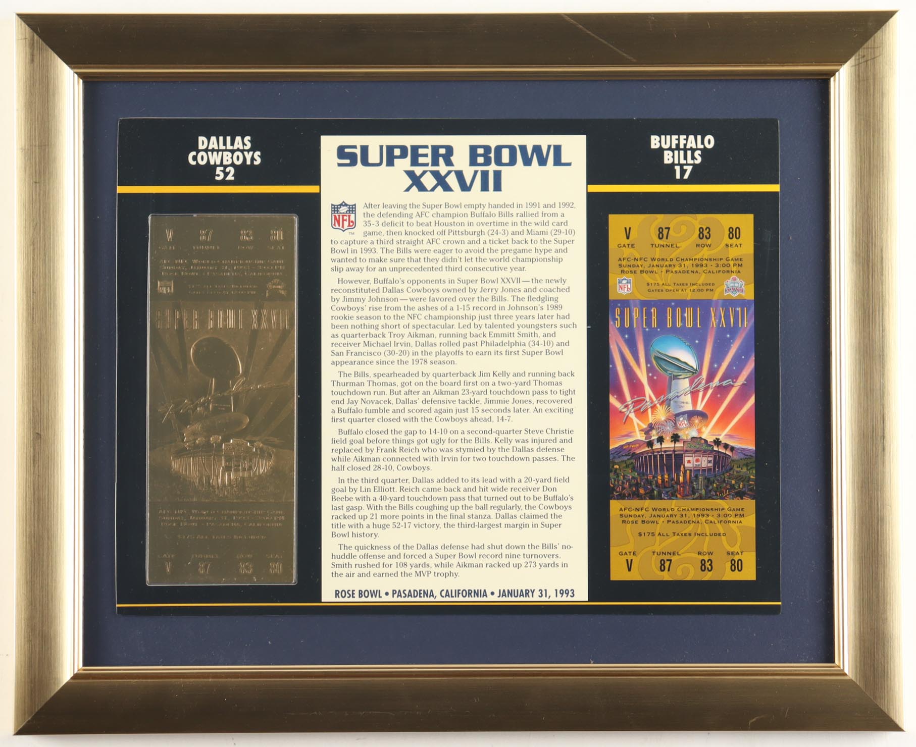 Custom Framed Super Bowl XXVII Commemorative Score Card with 23KT Gold Ticket Framed Display