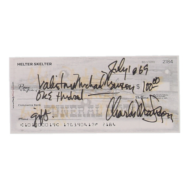 Check dated July 1969 measures approximately 3" x 6" in size and has been hand-signed by Charles Manson (D. 2017).