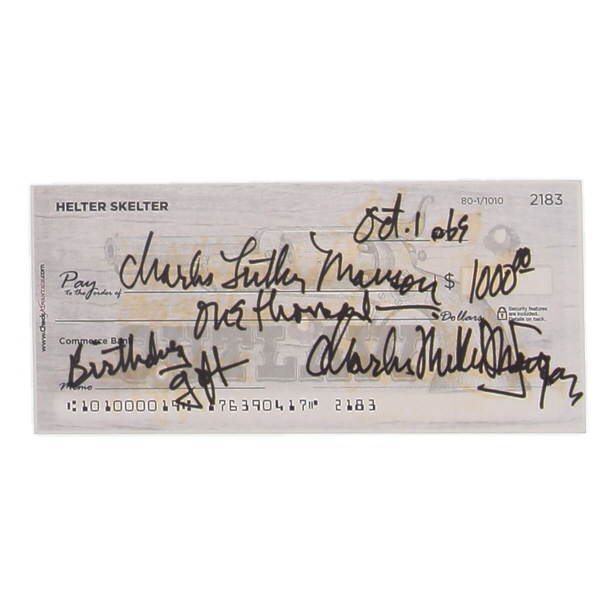Check dated October 1969 measures approximately 3" x 6" in size and has been hand-signed by Charles Manson (D. 2017).