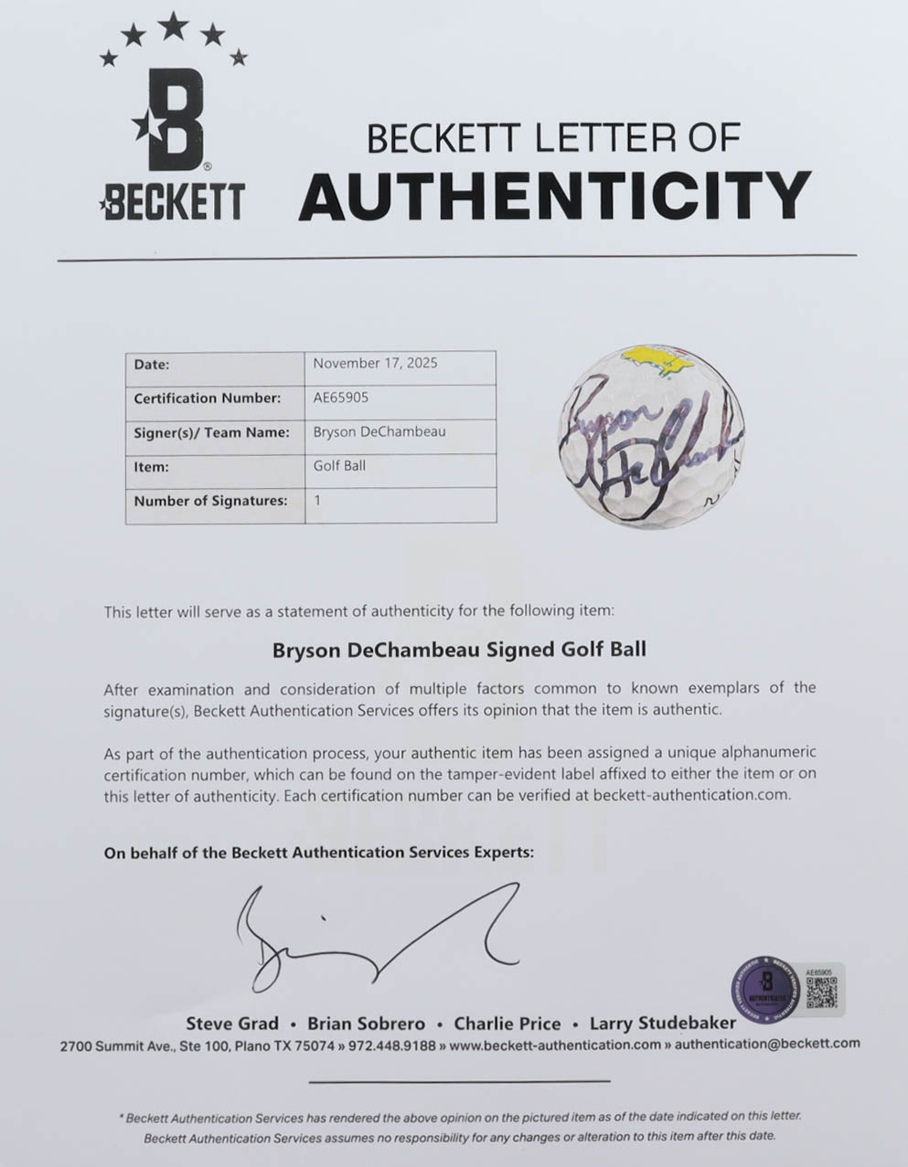 Bryson DeChambeau Signed Masters Logo Golf Ball (Beckett)