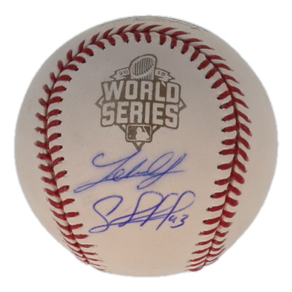 Rawlings Official 2015 World Series logo baseball. Hand-signed by Salvador Perez and Johnny Cueto (Kansas City Royals). Please note, the signature ink has bled.