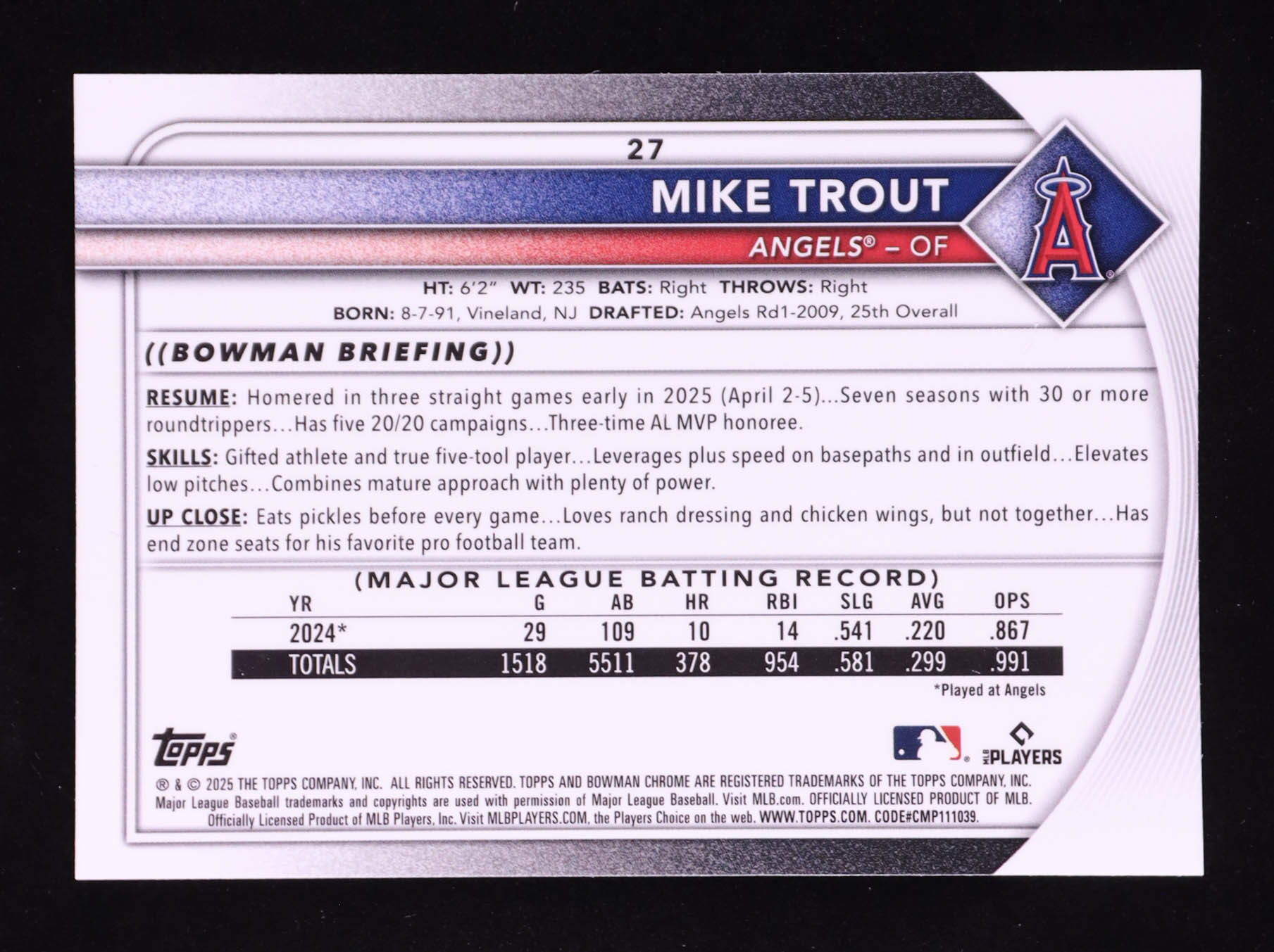 Mike Trout 2025 Bowman Chrome Mega Box Blue Refractors #27 #75/150