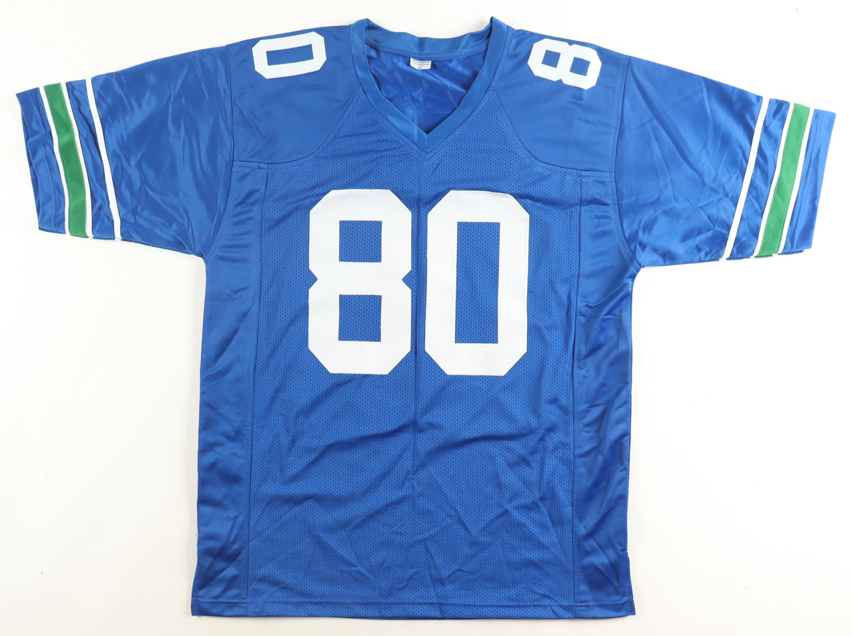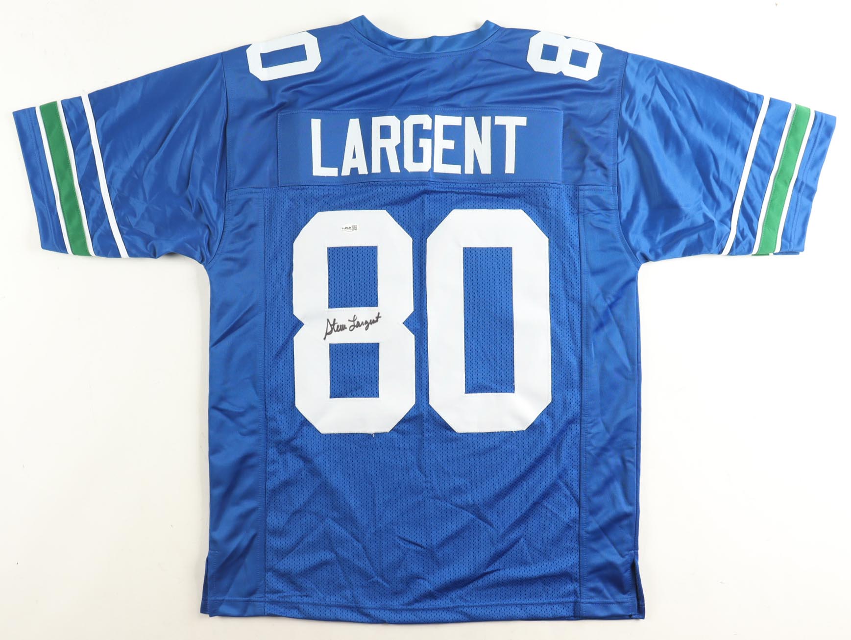 Custom jersey. Everything is sewn on, size XL. Hand-signed by Steve Largent (HOF). Please note, the signature ink has bled.