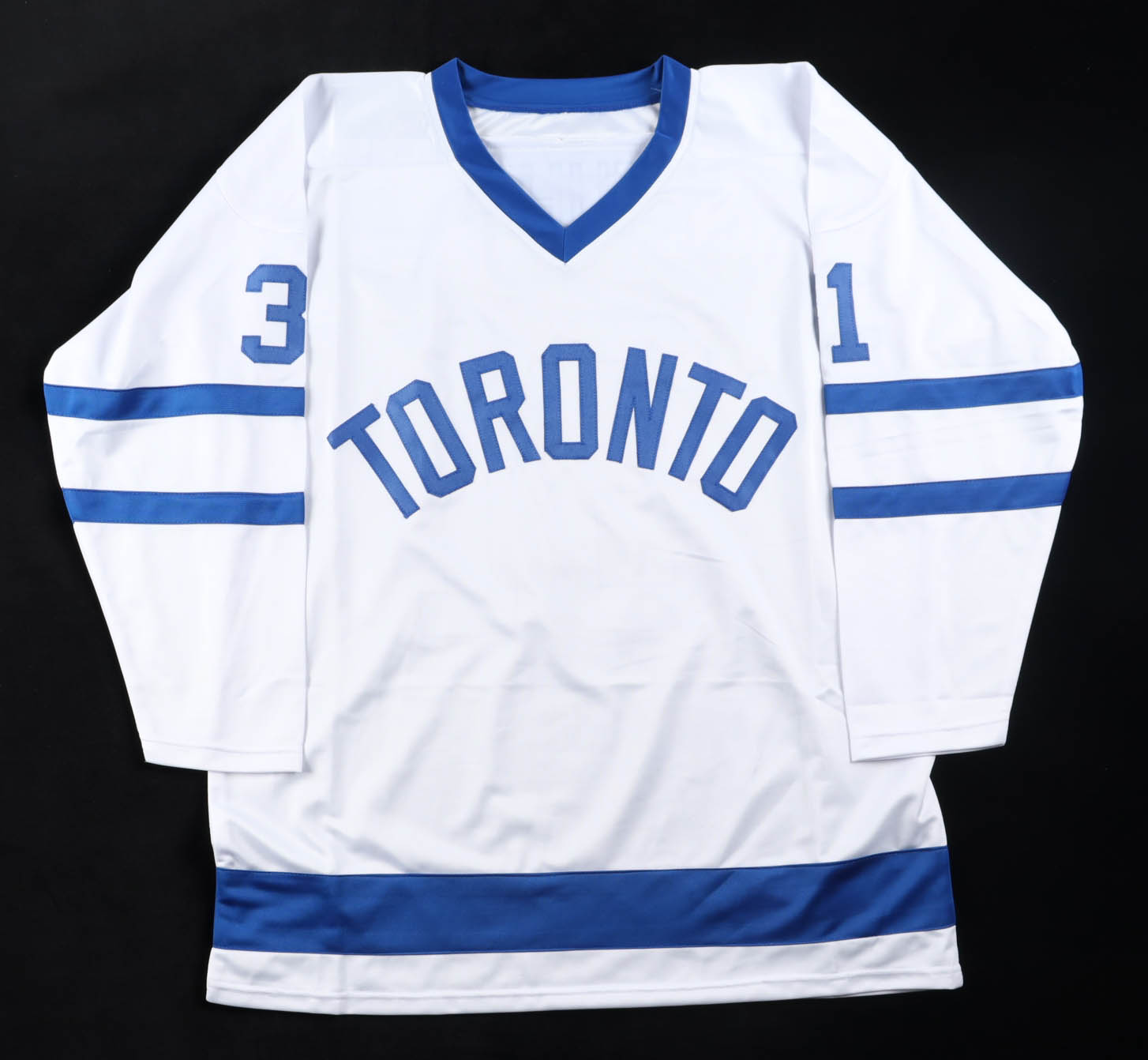 Custom jersey with everything sewn on, size XL. Hand-signed by Grant Fuhr (HOF).