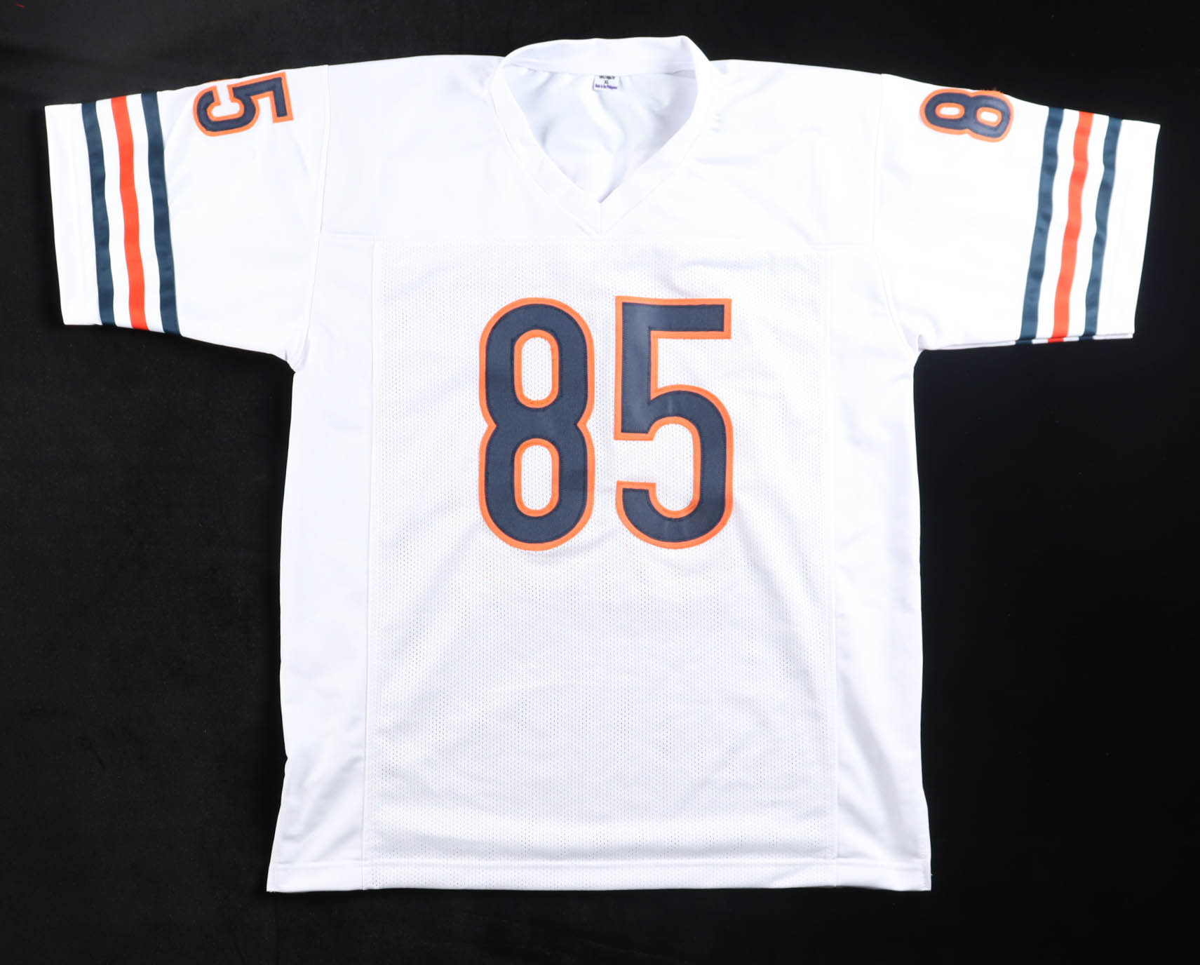 Custom jersey with everything sewn on, size XL. Hand-signed by (12) with Mike Singletary (HOF), Willie Gault, Shaun Gayle, Stefan Humphries, Kevin Butler, Dennis Gentry, Calvin Thomas, Dennis McKinnon, Kurt Becker, Tyrone Keys, Brian Baschnagel, and Gary Fencik. Please note, there is a stain on the name plate.