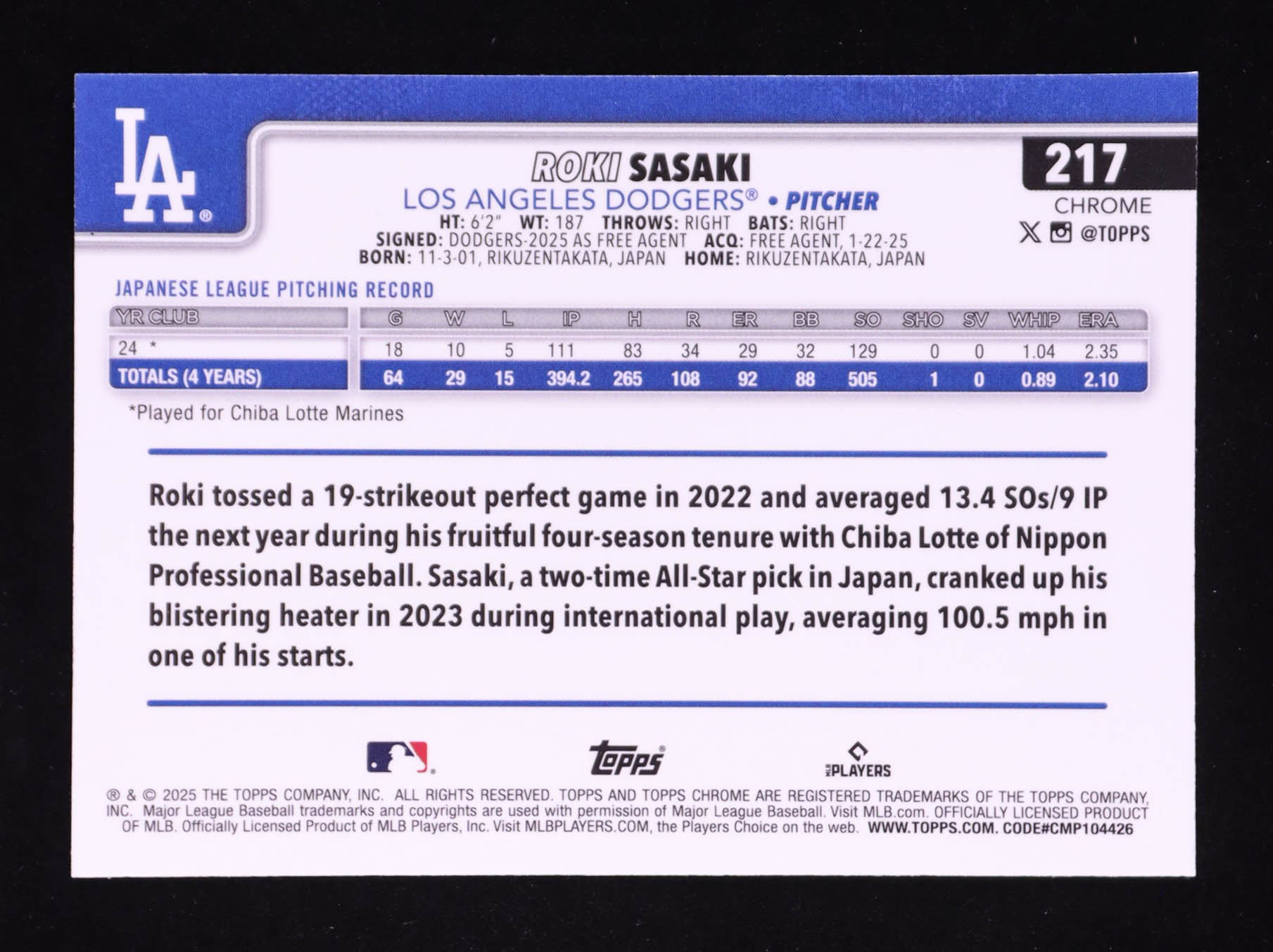Roki Sasaki 2025 Topps Chrome Lava Refractors #217 RC