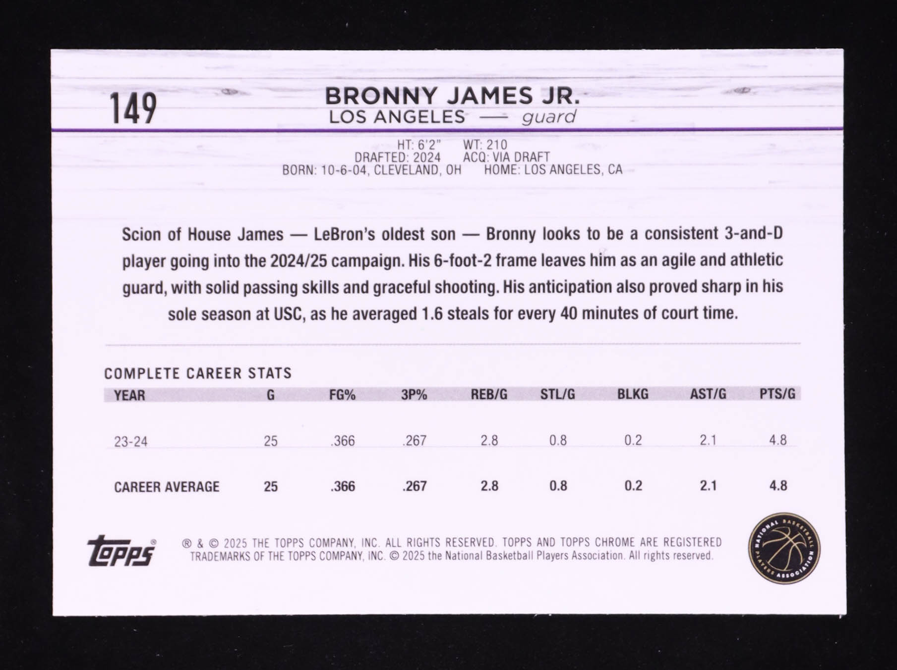 Bronny James Jr. 2024-25 Topps Chrome Blue Basketball Refractors #149 RC