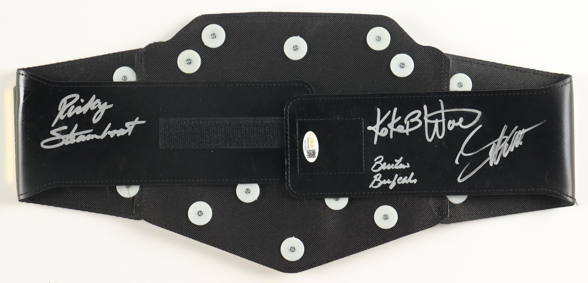 WWE plastic toy replica championship belt. Measures approximately 39" in length. Hand-signed and inscribed by Ricky Steamboat (HOF), Greg Valentine, Brutus Beefcake (HOF), and KoKo B. Ware (HOF).