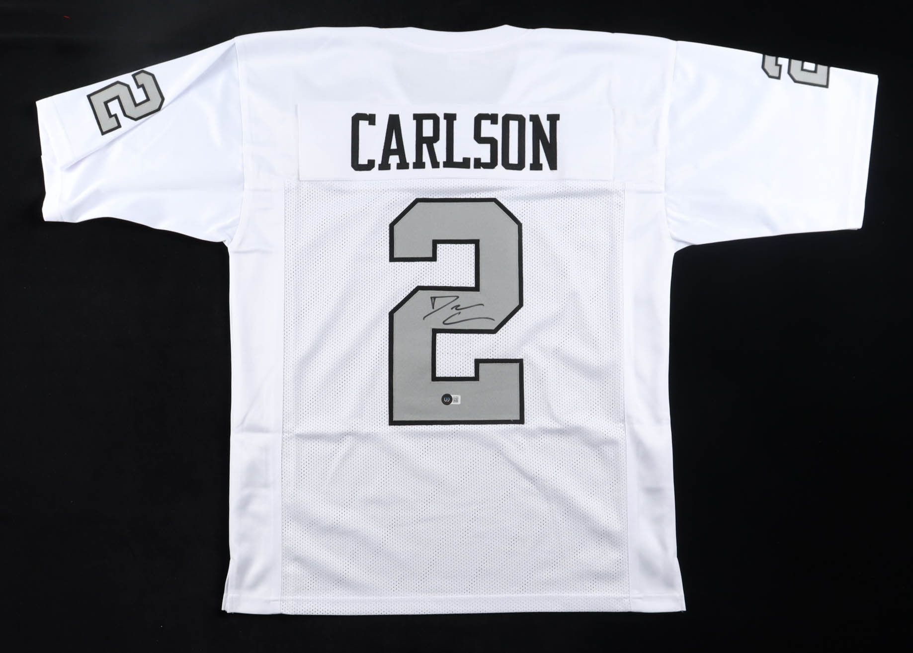 Custom jersey with everything sewn on, size XL. Hand-signed by Daniel Carlson.