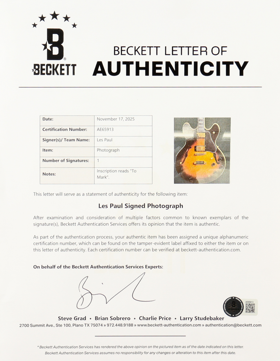 Custom frame measures 17.5" x 21.5" in size and has been hand-signed by Les Paul (D. 2009, HOF). Please note the autograph is made out to "Mark".