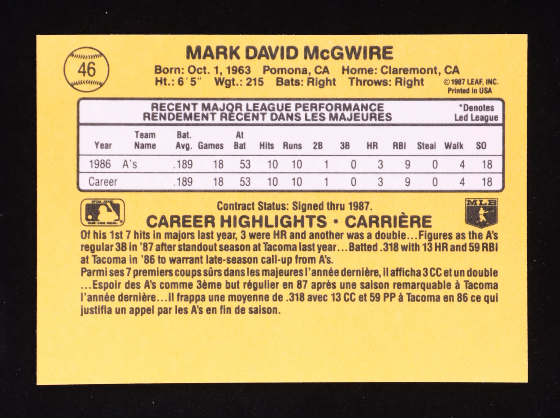 Mark McGwire 1987 Leaf/Donruss #46 RR RC