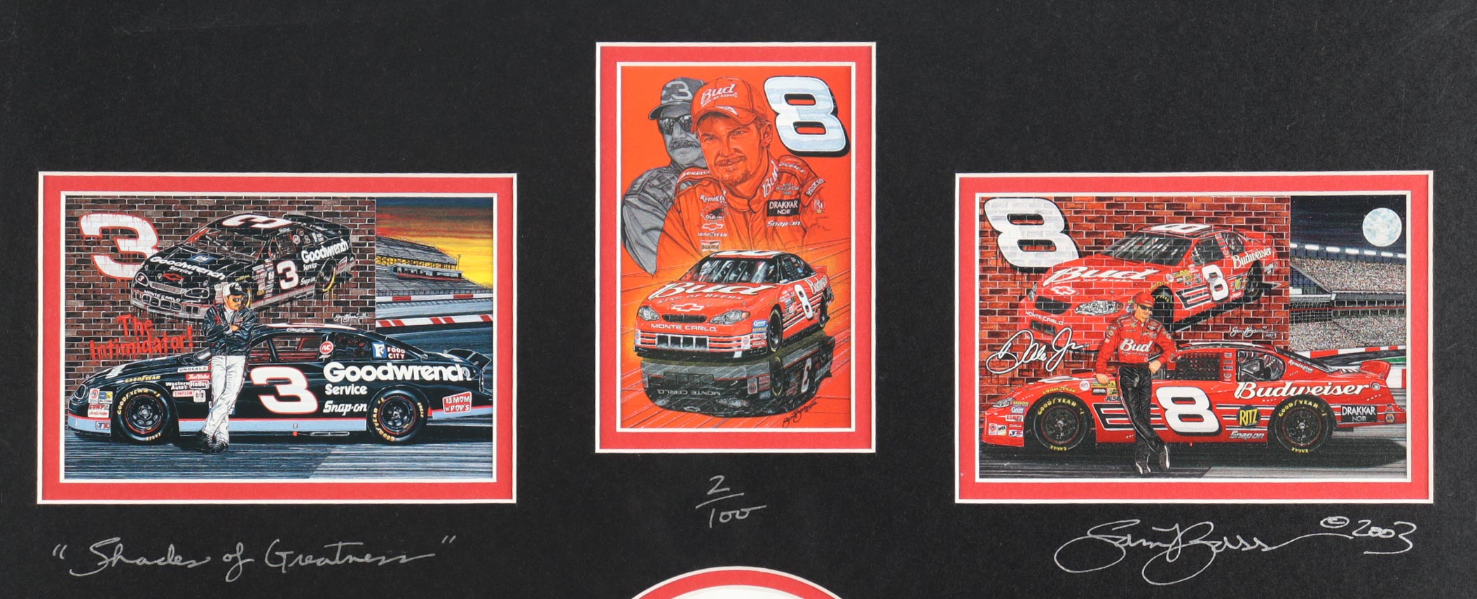 Custom frame measures approximately 15.5" x 21" in size. Display is hand-signed by Sam Bass. Display also includes (3) index card art prints. Please note the Dale Earnhardt Sr. signature is facsimile. Item is limited edition #2/100.
