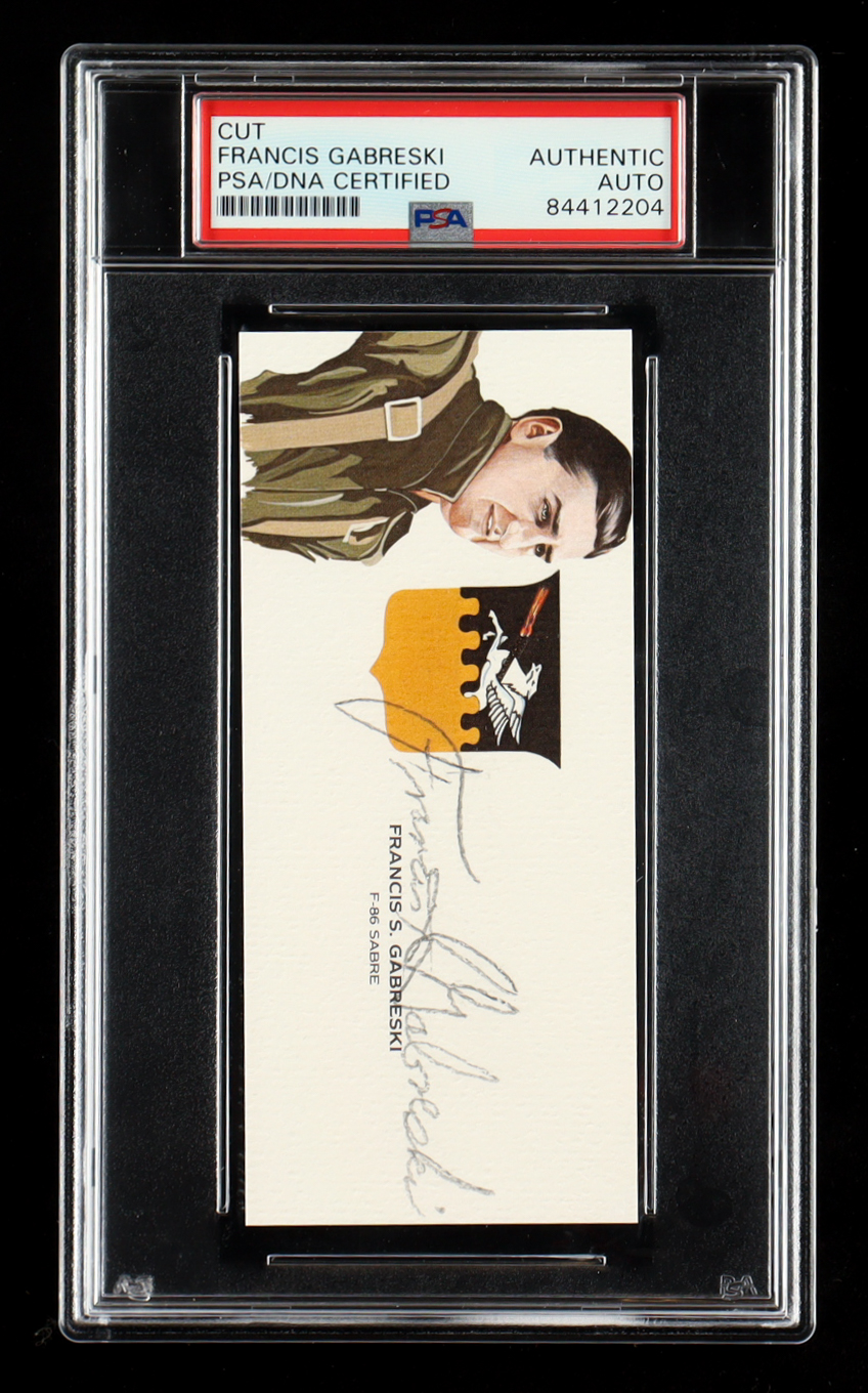Cut measures approximately 2" x 5" in size has been hand-signed by Francis "Gabby" Gabreski (D. 2002).