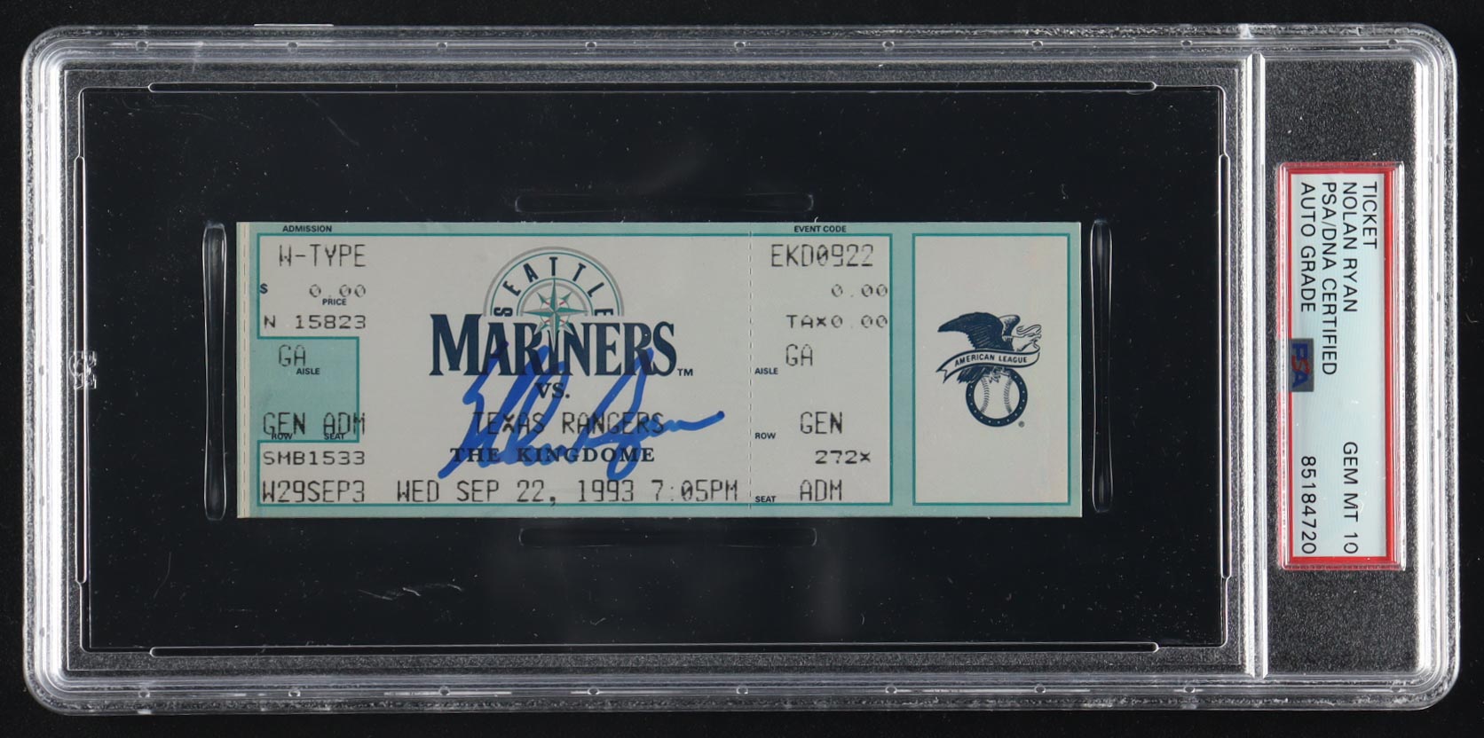 1993 Original Game ticket has been hand-signed by Nolan Ryan (Texas Rangers, HOF) and graded (PSA 10). Please see photos for details regarding the item.