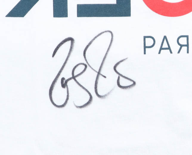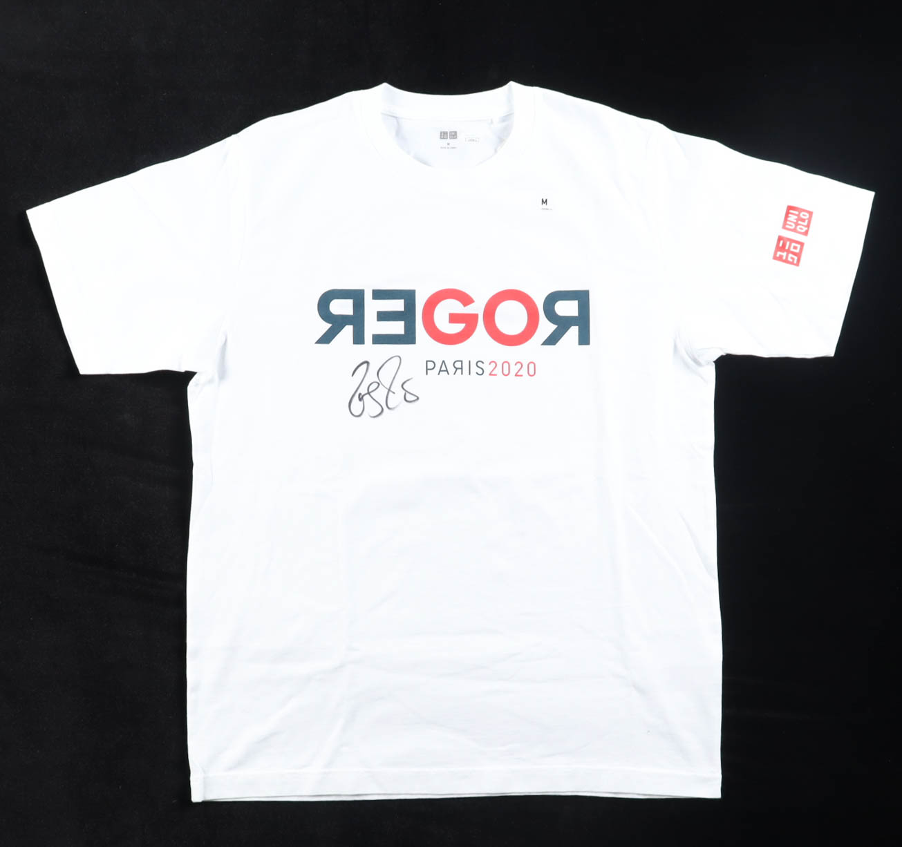 Custom tennis t-shirt with everything printed on, size M. Hand-signed by Roger Federer.