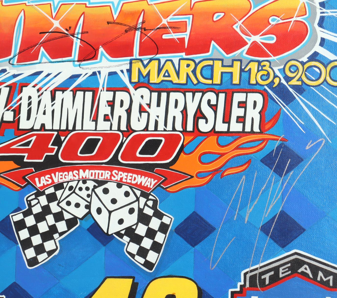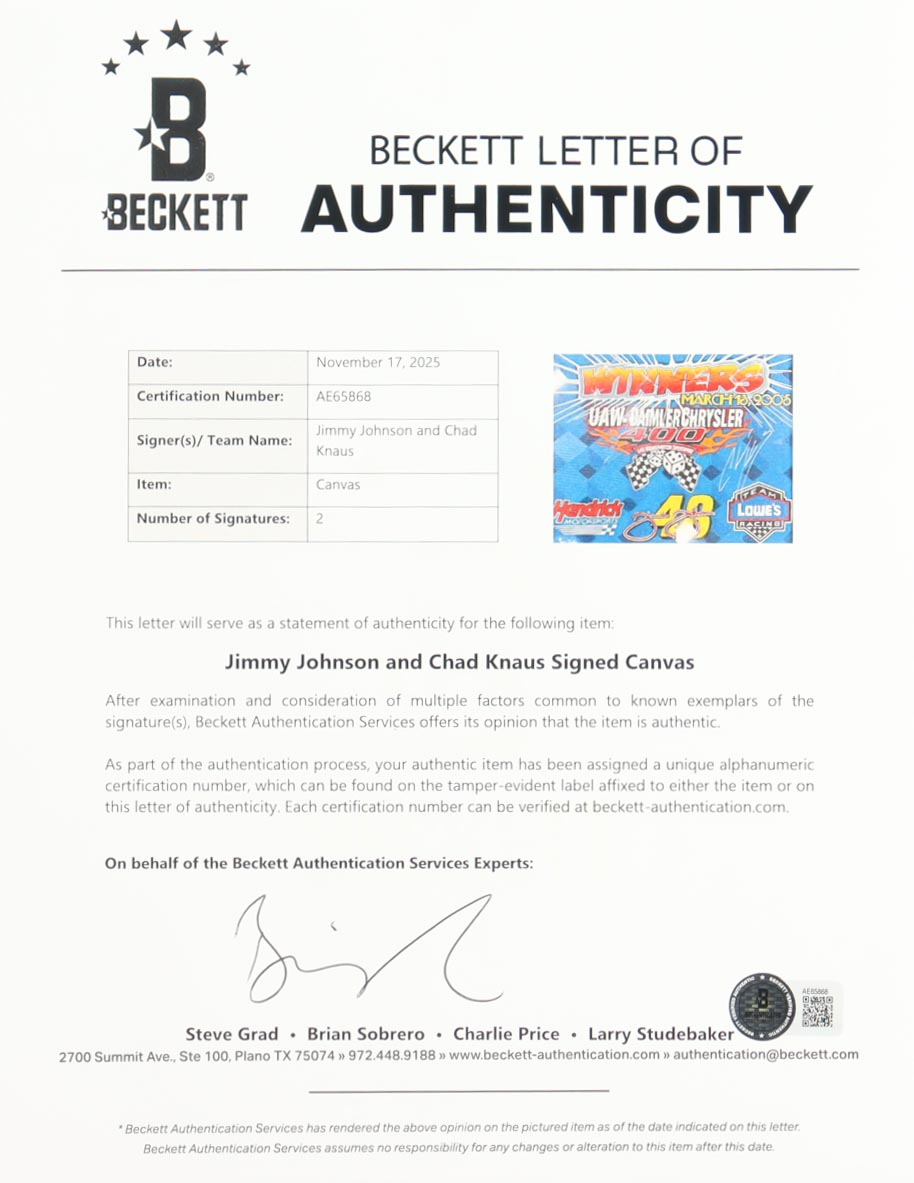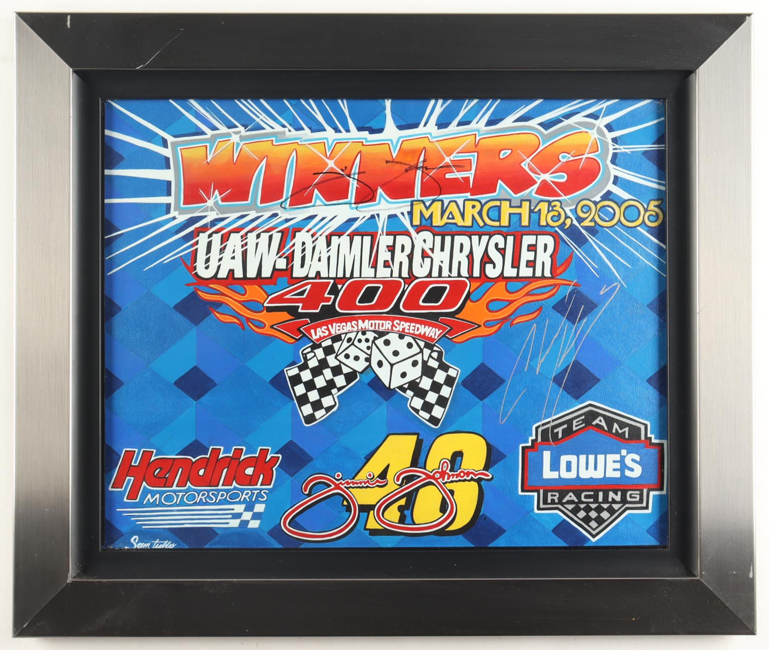 Custom frame measures approximately 22" x 26" in size. Canvas is hand-signed by Jimmie Johnson and Chad Knaus.