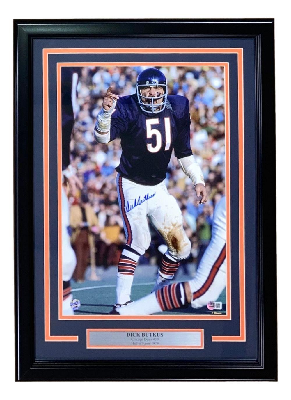 Custom frame measures 16” x 22” in size and features a photo that has been hand-signed by Dick Butkus (D. 2023, Chicago Bears, HOF).