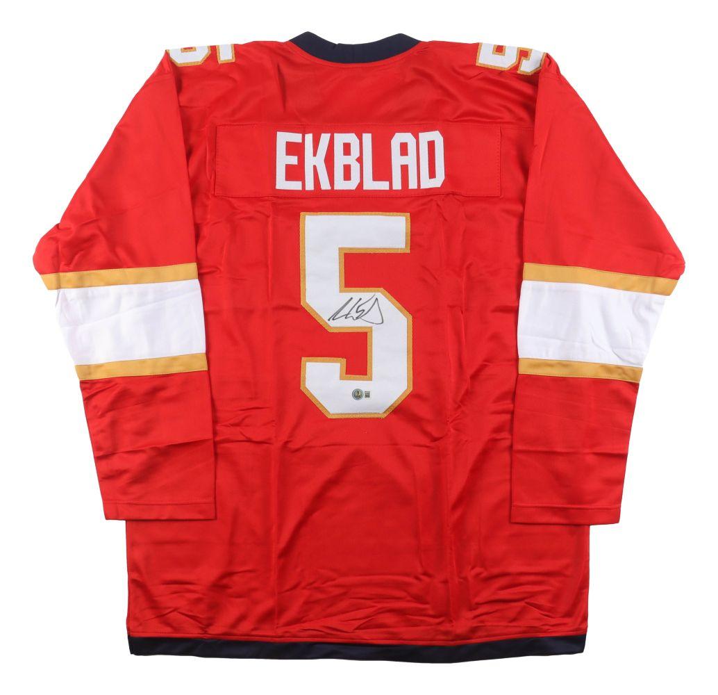 Custom jersey with everything sewn on, size XL. Hand-signed by Aaron Ekblad.