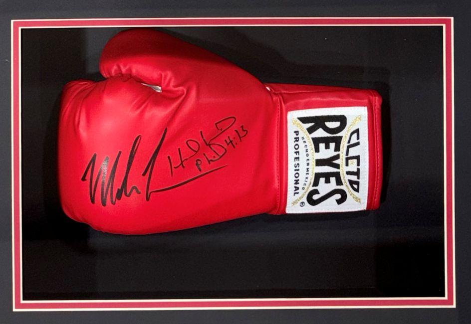 Custom shadowbox measures approximately 16" x 19" x 5" in size and features an Cleto Reyes boxing glove that has been hand-signed by Mike Tyson (HOF) and Evander Holyfield.