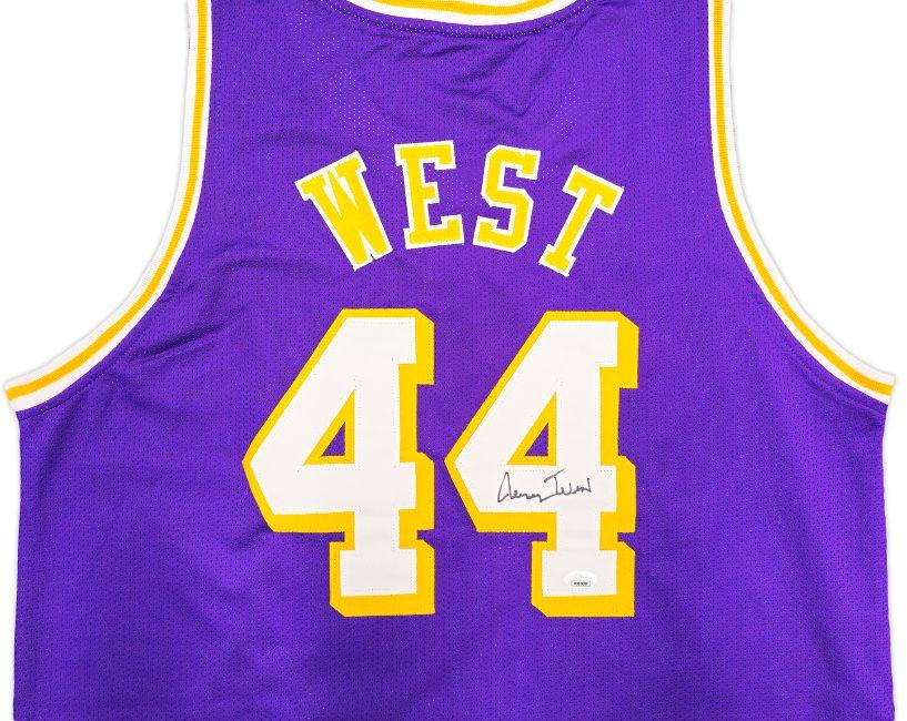Custom jersey with everything sewn on, size XL. Hand-signed by Jerry West (D. 2024, HOF).