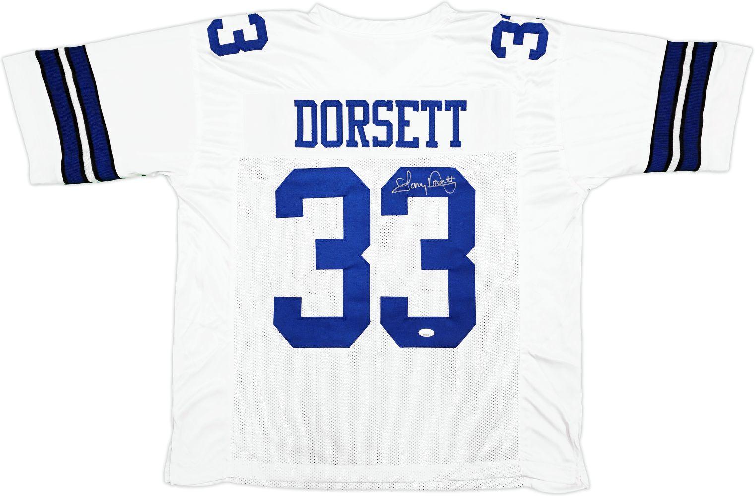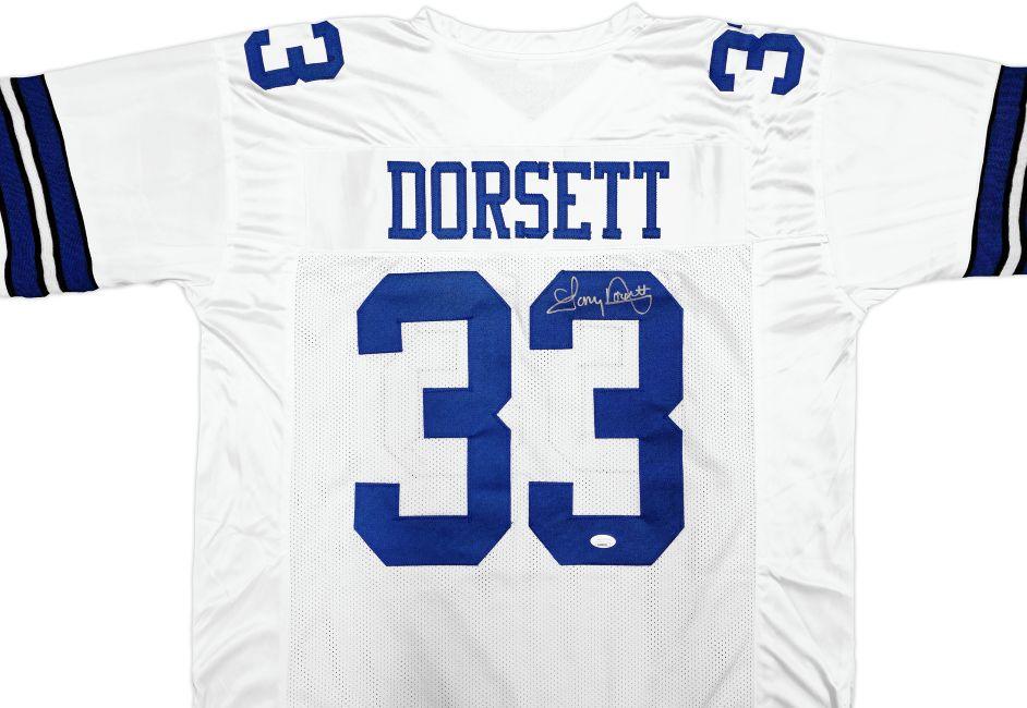 Custom jersey with everything sewn on, size XL. Hand-signed by Tony Dorsett (HOF).