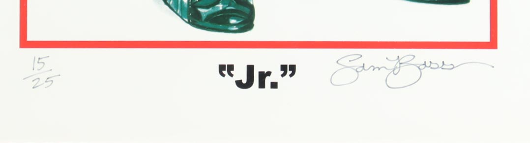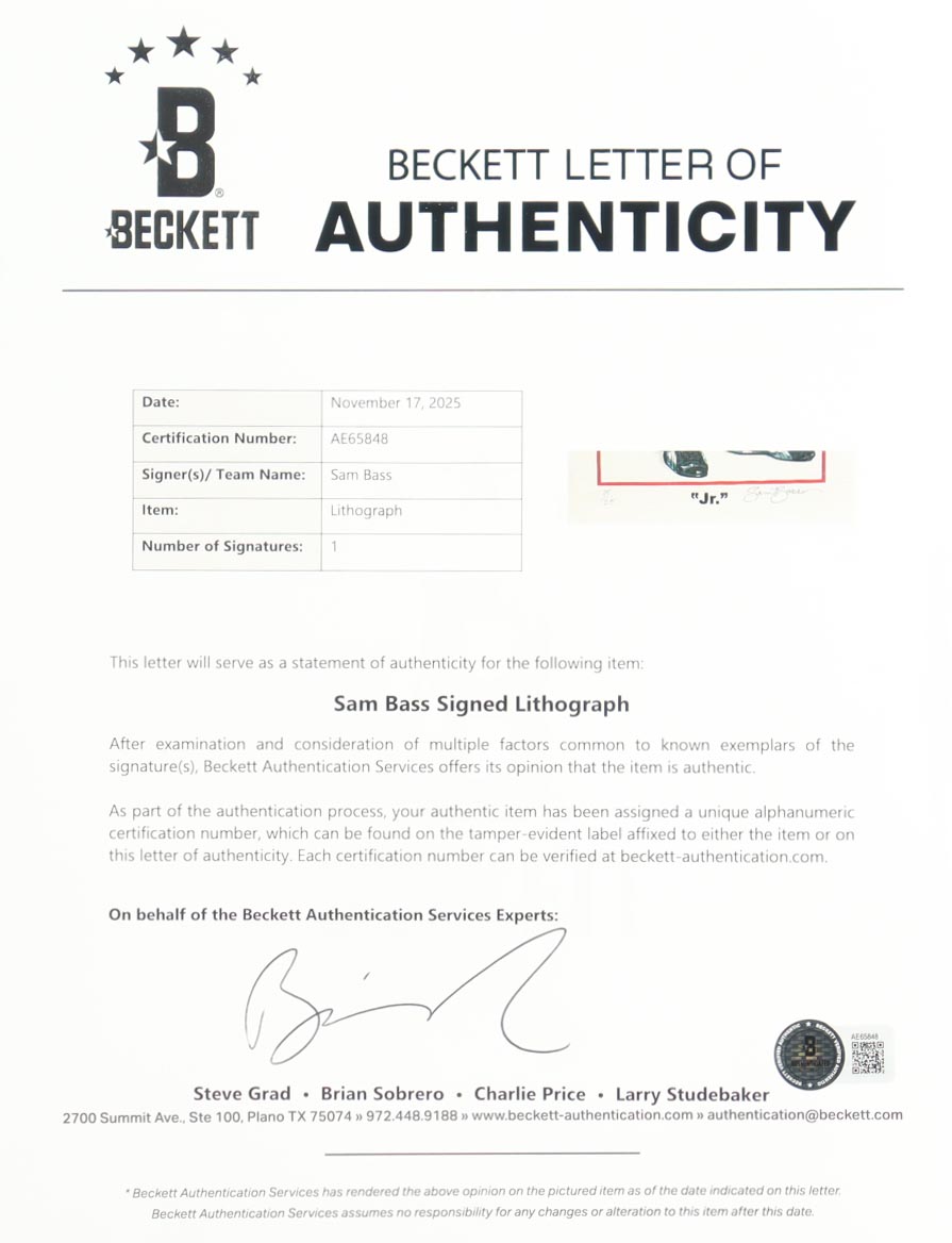 Custom frame measures approximately 22" x 26.5" in size. Lithograph is hand-signed by Sam Bass. Item is limited edition #15/25.