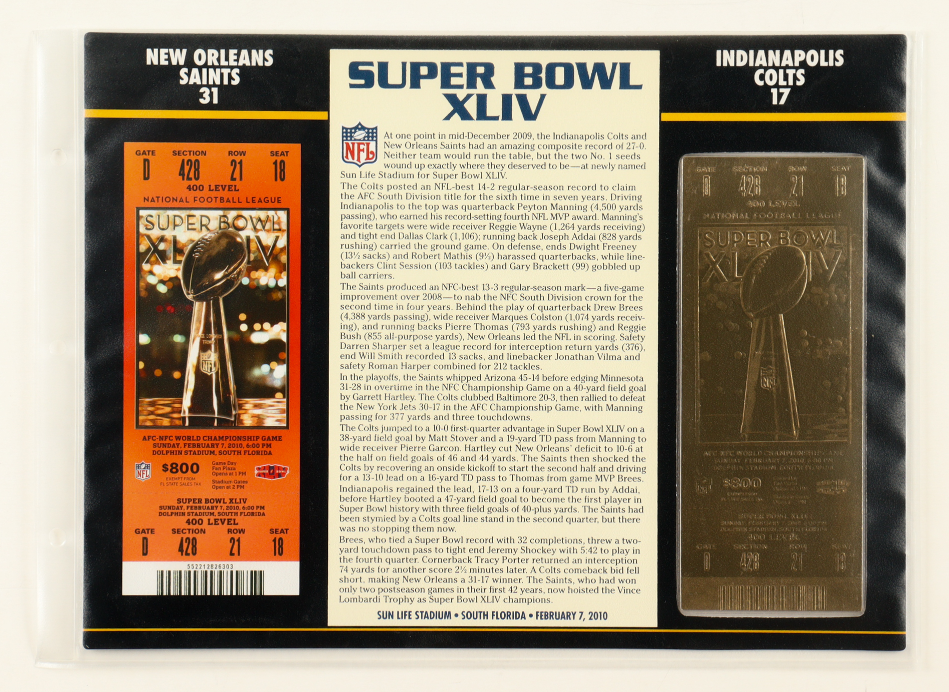 Display features a 2010 Super Bowl XLIV commemorative golden ticket as well as an informational article.
