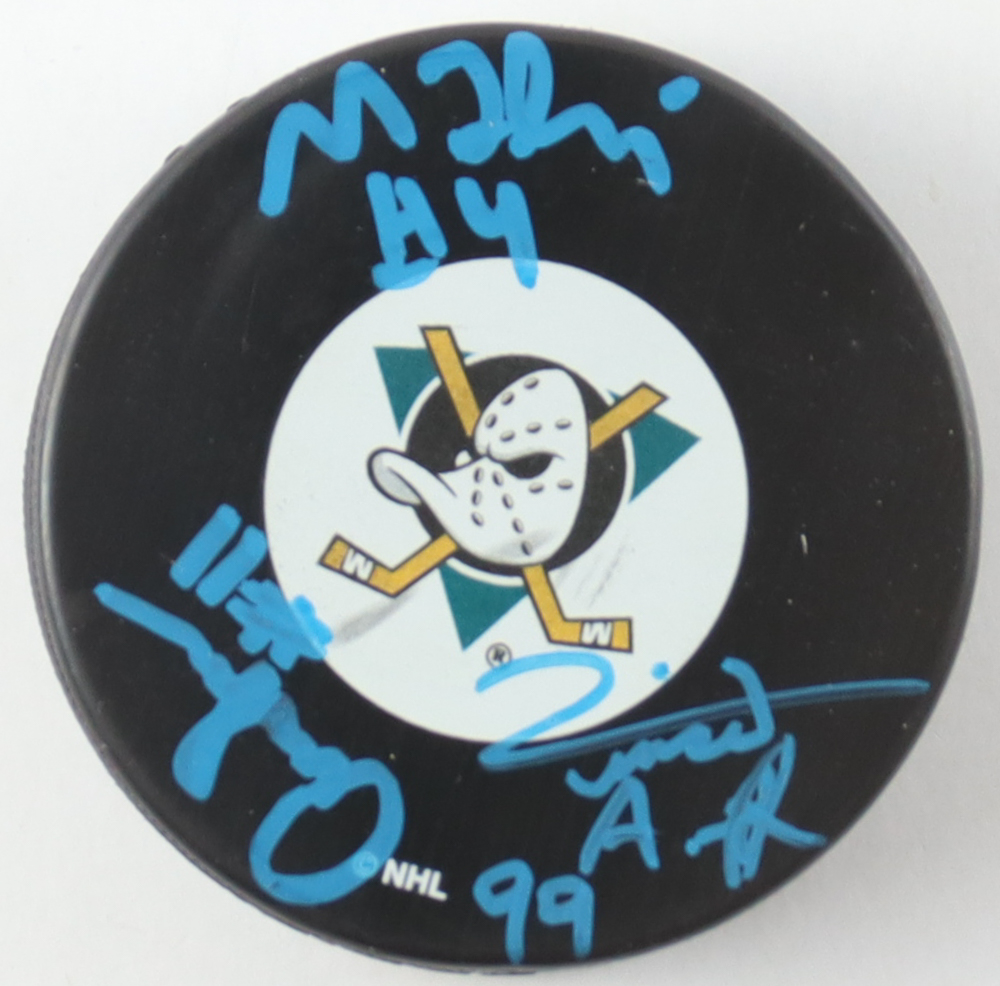 Aaron Schwartz, Matt Doherty & Vincent Larusso Signed "The Mighty Ducks" Hockey Puck (Beckett)