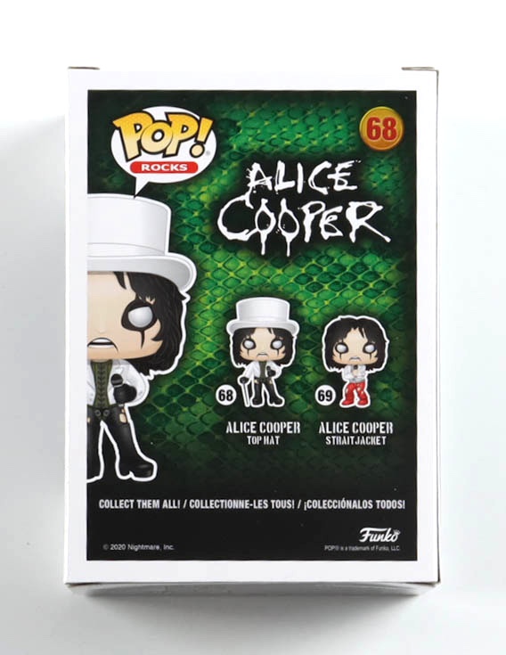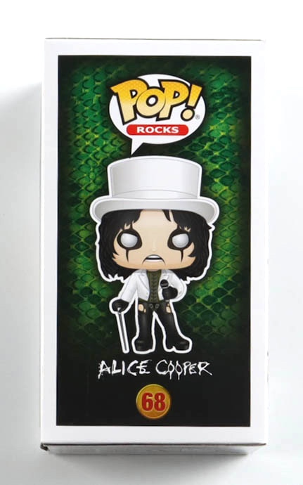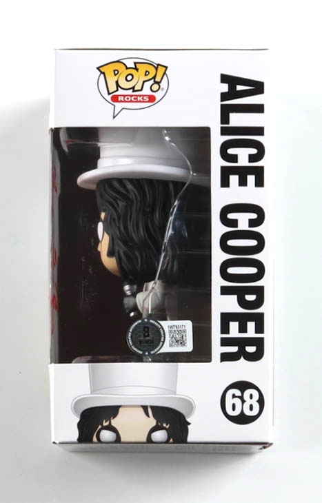 Vinyl figure measures approximately 4" tall and has been hand-signed and inscribed on the packaging by Alice Cooper (HOF). Please note, there are creases throughout the packaging.