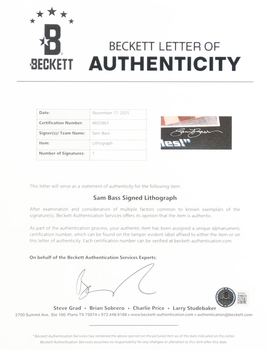 Custom frame measures approximately 22" x 37" in size. Art print is hand-signed by Sam Bass. Item is limited edition #58/388.