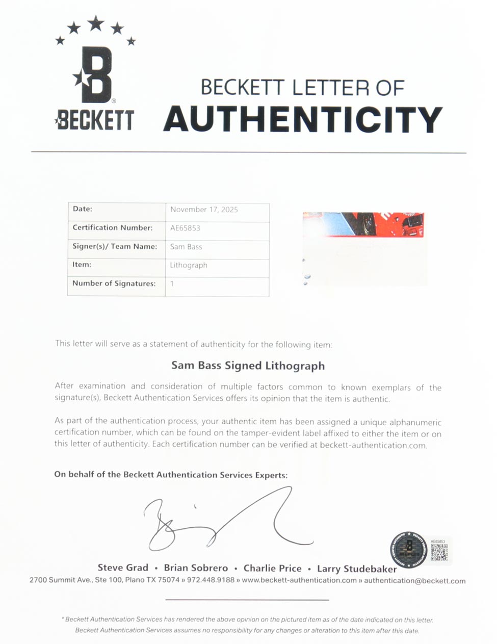 The autograph includes an official Beckett Authentication Services hologram and matching LOA for authenticity purposes.