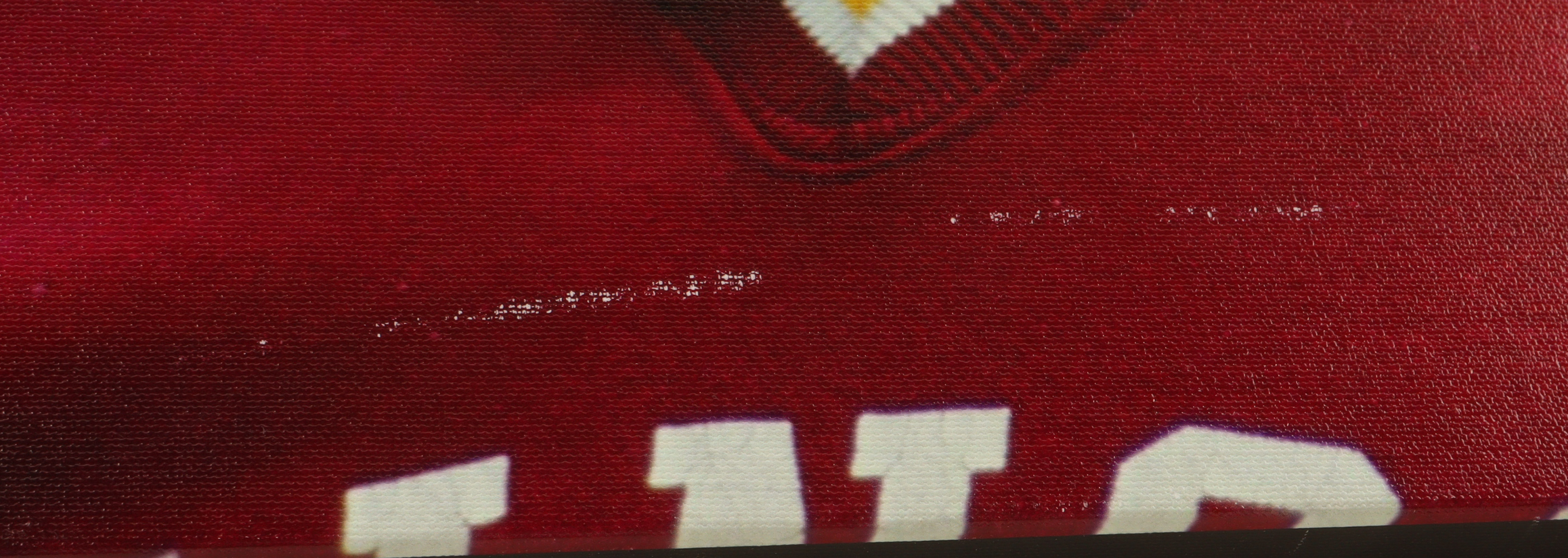 Custom frame measures approximately 20" x 24" in size and features a serigraph signed and inscribed by Bobby Bowden (D. 2021). Please note that the canvas shows slight signs of damage.