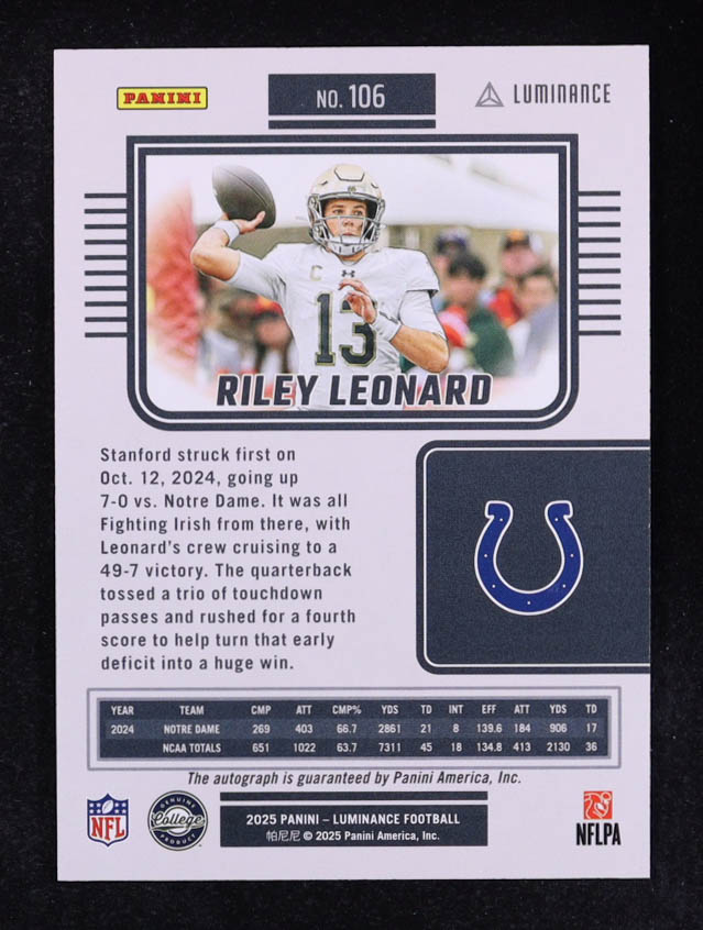 Riley Leonard 2025 Panini Luminance Autographs Blue #106 RC #18/50