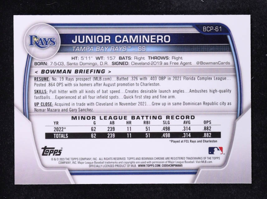 Junior Caminero 2023 Bowman Chrome Prospects #BCP61 RC