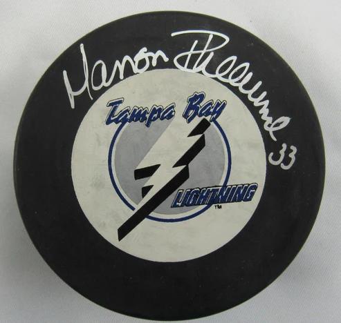 Tampa Bay Lightning logo hockey puck has been hand-signed by Manon Rheaume.