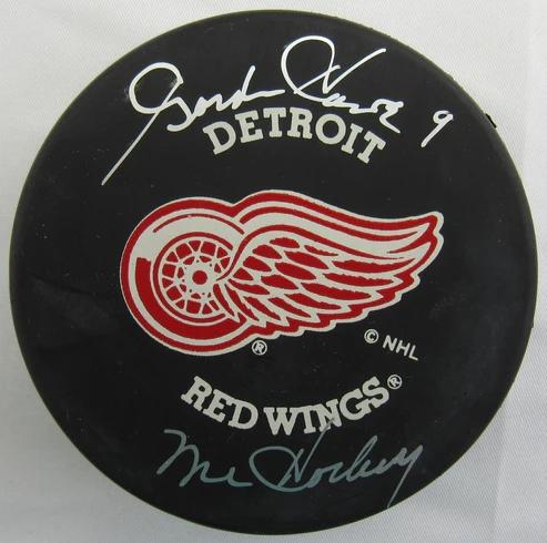 Detroit Red Wings logo hockey puck has been hand-signed and inscribed by Gordie Howe (HOF, D. 2016).